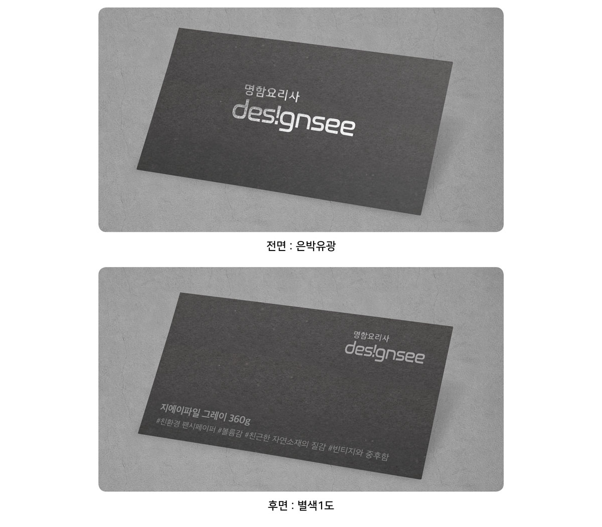 은박 유광(단면) 명함인쇄 프리미엄 용지 특수지 그문드코튼 지에이파일 앤틱블랙 쿠션지 명함