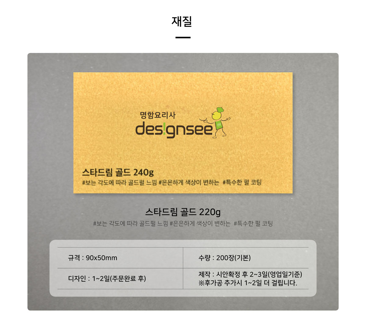 바탕색이나 배경색을 넣지 않는 것이 원단자체의 골드펄 느낌을 잘 살려 세련되고 특색있는 명함을 연출할 수 있습니다.