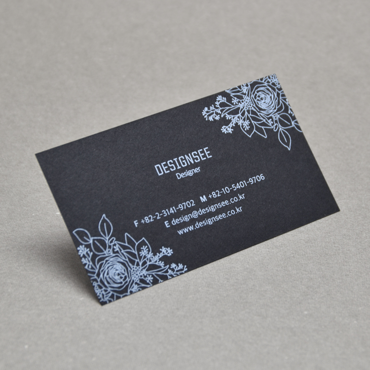 고급 색지 위에 화이트 별색 한 가지 색상만으로 심플하면서 고급스러운 명함을 표현하거나,