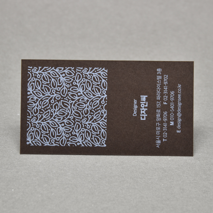 고급 색지 위에 화이트 별색 한 가지 색상만으로 심플하면서 고급스러운 명함을 표현하거나,