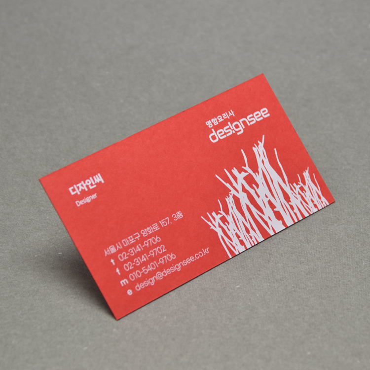 고급 색지 위에 화이트 별색 한 가지 색상만으로 심플하면서 고급스러운 명함을 표현하거나,