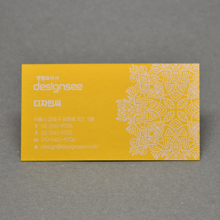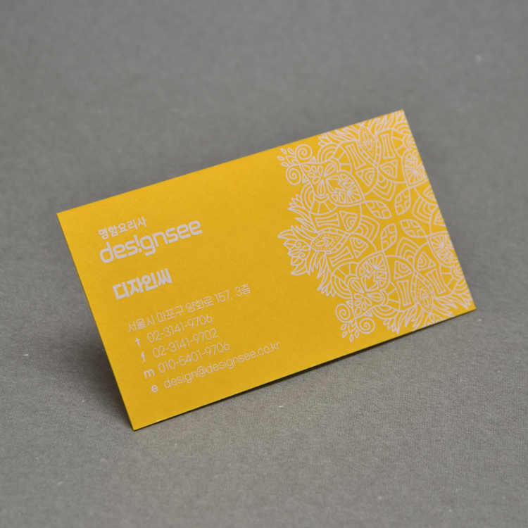 고급 색지 위에 화이트 별색 한 가지 색상만으로 심플하면서 고급스러운 명함을 표현하거나,
