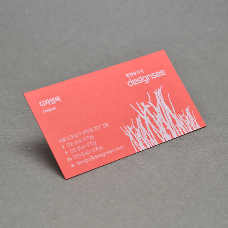 고급 색지 위에 화이트 별색 한 가지 색상만으로 심플하면서 고급스러운 명함을 표현하거나,